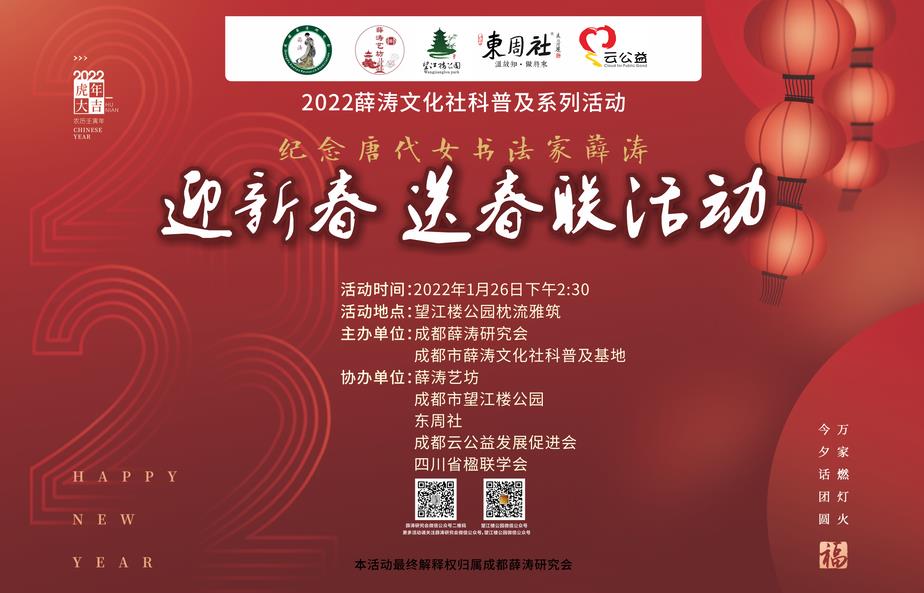 主办方介绍了举办此次活动的缘由:四川历史名人薛涛不仅是唐代著名女诗人、大唐女官、诗笺始祖,还是一位女书法家。为纪念唐代著名女书法家薛涛,在壬寅虎年新春佳节即将来临之际,成都薛涛研究会和成都市薛涛文化社科普及基地特意于薛涛纪念地、祠宇型园林——望江楼公园开展此次活动。