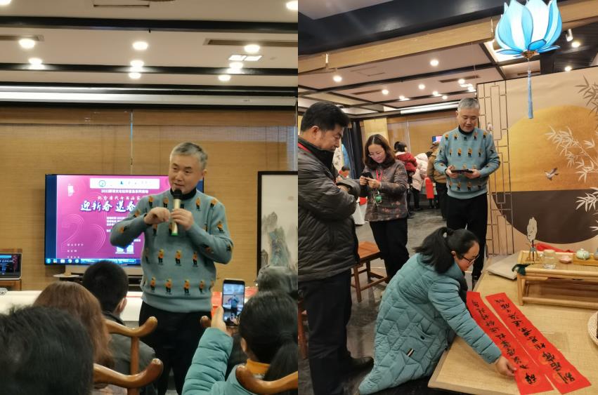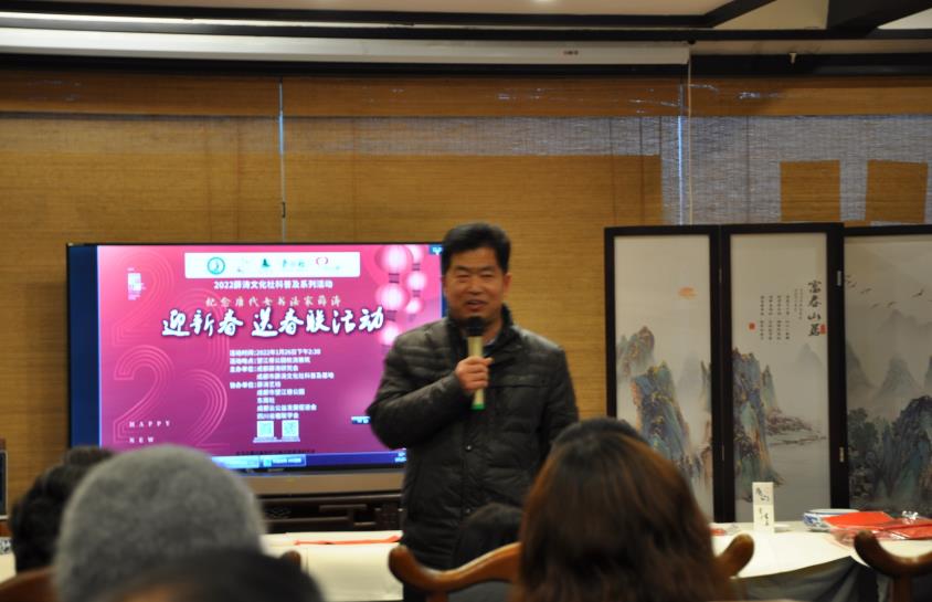 1月26日下午,“纪念唐代女书法家薛涛——迎新春、送春联”公益惠民活动在望江楼公园枕流雅筑举行。此次活动由成都薛涛研究会、成都市薛涛文化社科普及基地联合主办,成都市望江楼公园、薛涛艺坊、东周社、成都云公益发展促进会、四川省楹联学会等单位协办,成都市望江楼公园副书记张讲社、成都薛涛研究会常务副会长谢天开、东周社主讲人周东、成都云公益发展促进会会长傅艳、四川省楹联学会副会长李兴辉、成都市书法家协会原秘书长袁碧秀、四川徐悲鸿张大千艺术研究院办公室副主任梅渝林、散花楼女子诗社社长陶佳桂、薛涛艺坊负责人姚晓梅、贺刚、成都薛涛研究会秘书长汪辉秀、副秘书长周渝霞、理事郑洁等嘉宾及现场观众数十人参加了此次活动。