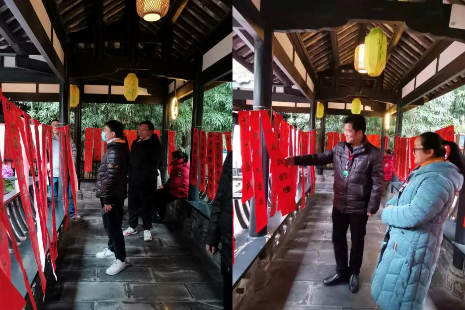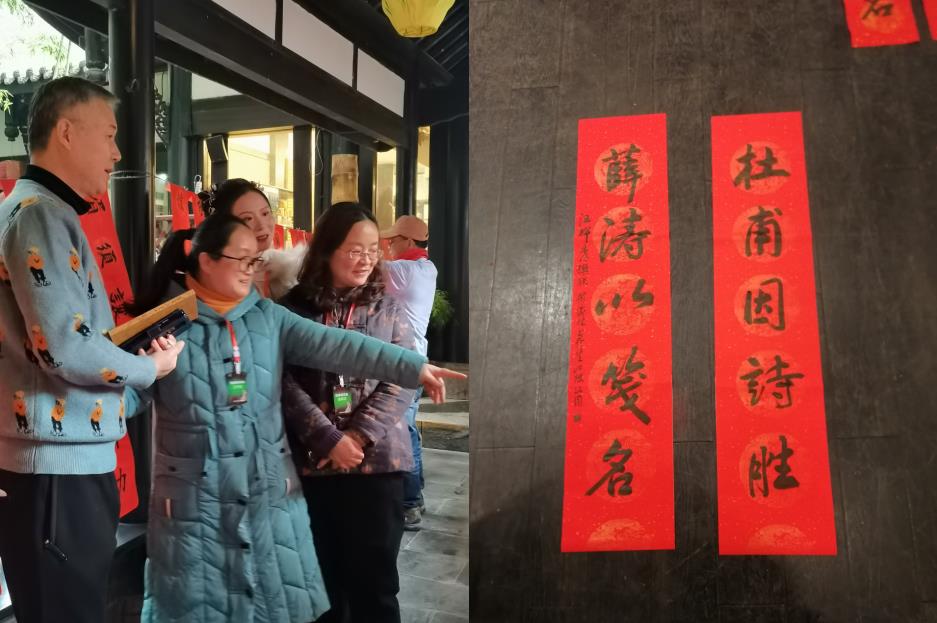 此次活动书写和展览的对联有两种:一是此前征集到的薛涛与望江楼主题对联优秀作品,二是传统春联,吸引了不少游客前来品读、鉴赏。